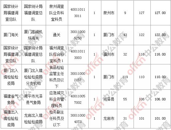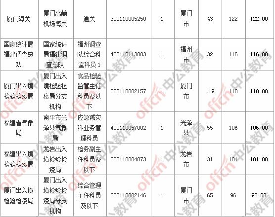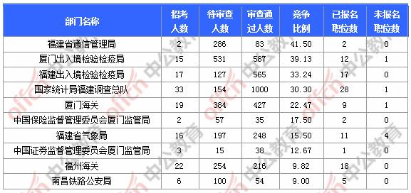 報名通過審核人數(shù)前十的職位主要集中在廈門出入境檢驗檢疫局、國家統(tǒng)計局福建調(diào)查總隊、廈門海關等部門,具體信息如下: