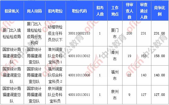 截止到2日16時,競爭比例的職位為廈門出入境檢驗檢疫局廈門出入境檢驗檢疫局分支機構(gòu)動植物檢疫主任科員及以下300110002153一職,招錄1人,截止到2日16時通過人數(shù)為231人,競爭比例231:1!