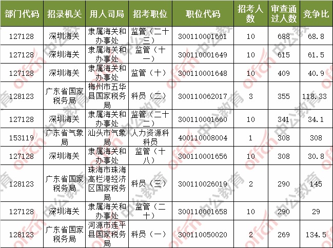 報名通過審核人數前十的職位主要集中在深圳海關、廣東省國家稅務局、廣東省氣象局等部門,具體信息如下: