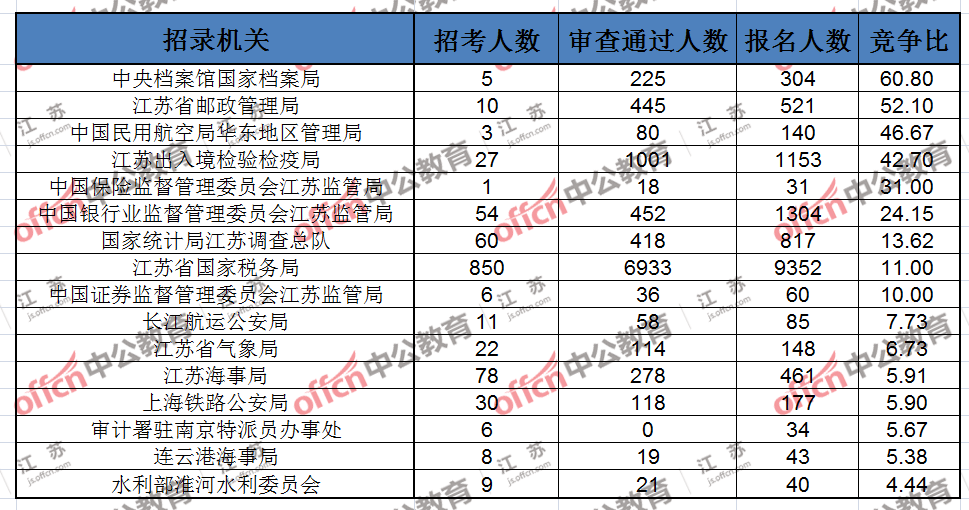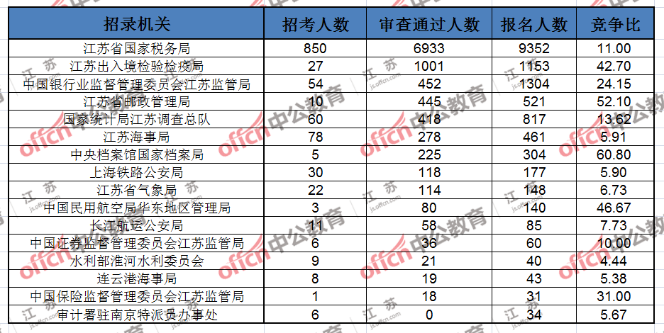 截至11月2日16時,據中公教育統計,國考職位中工作地點在江蘇的職位通過審核總人數為10216人,平均競爭比例為12.43:1。