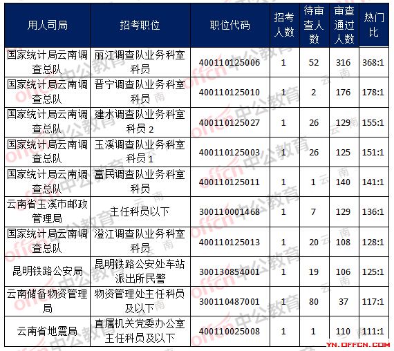 截止11月2日16時,國考報名第三天,國家統計局云南調查總隊,麗江調查隊業務科室科員,職位代碼:400110125006,招錄1人,審查通過人數為316人,具體信息如下: