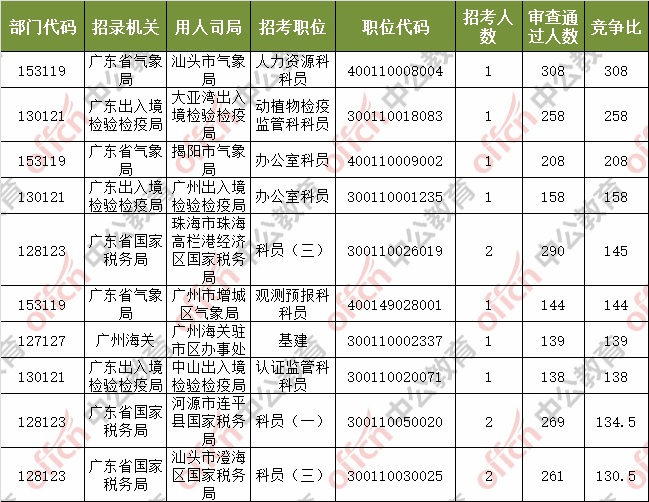 報(bào)名通過(guò)審核人數(shù)前十的職位主要集中在深圳海關(guān)、廣東省國(guó)家稅務(wù)局、廣東省氣象局等部門(mén),具體信息如下: