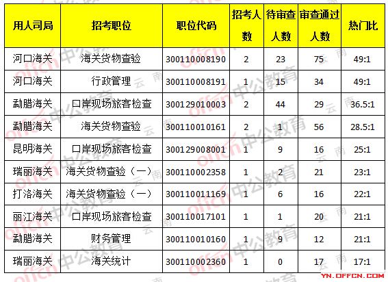 當前河口海關海關貨物查驗,職位代碼300110008190的崗位相比報名人數為多,招2人,23人報名待審,75人過審,熱門比為:49:1