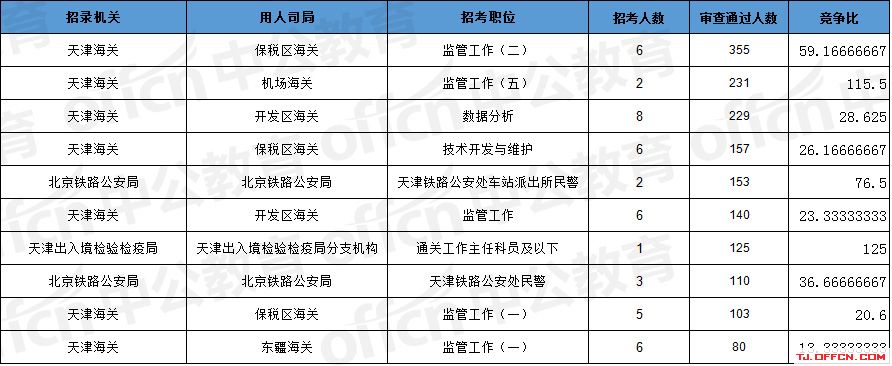 報名通過審核人數前十的職位主要集中在天津海關、北京鐵路公安局、天津出入境檢驗檢疫局等部門,具體信息如下: