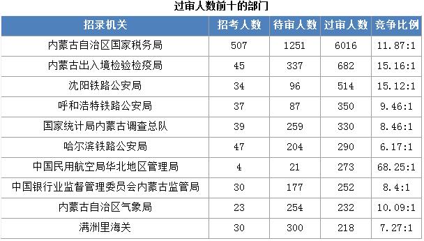 截止到2日16時,通過審核人數前三位的部門依次是:內蒙古自治區國家稅務局(過審6016人)、內蒙古出入境檢驗檢疫局(過審682人)、沈陽鐵路公安局(過審514人),三部門通過審核總人數達7212人,占通過審核總人數的70.3%。
