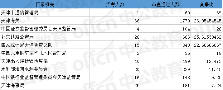 為幫助廣大考生更清晰的了解今日?qǐng)?bào)名情況,中公網(wǎng)校整理了審核通過(guò)人數(shù)前十位的部門(mén)以及競(jìng)爭(zhēng)比例最激烈的十大部門(mén),供廣大考生參考: