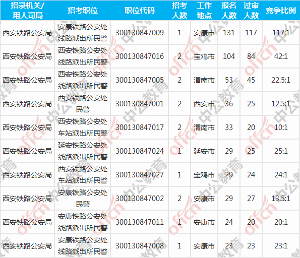 截至11月3日16時,據陜西中公網校統計,陜西國考職位鐵路公安系統中待審核人數為:126人,通過審核總人數為553人,崗位平均競爭比例為8:1。