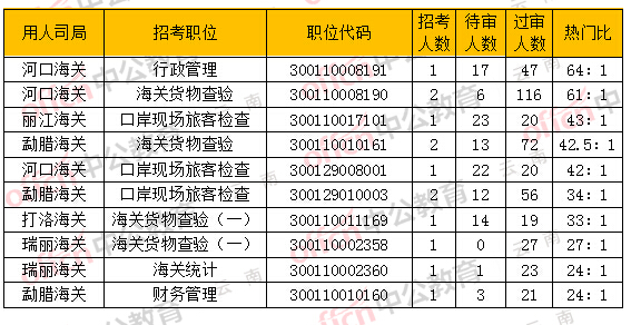 當前河口海關行政管理,職位代碼300110008191的崗位相比報名人數為多,招1人,17人報名待審,47人過審,熱門比為:64:1