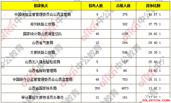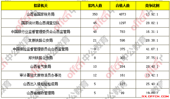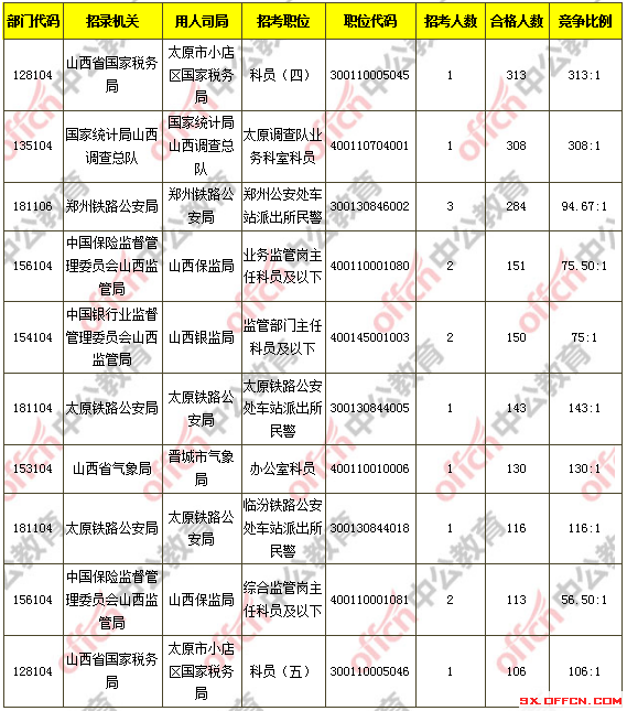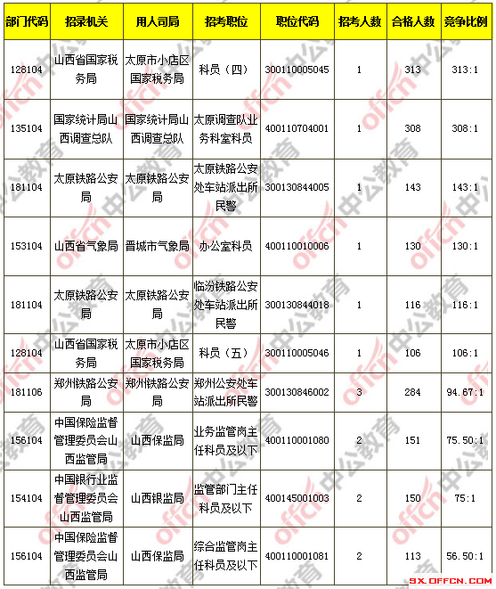 報名通過審核人數(shù)前十的職位主要集中在山西省國家稅務(wù)局、國家統(tǒng)計局山西調(diào)查總隊、鄭州鐵路公安局等部門,具體信息如下: