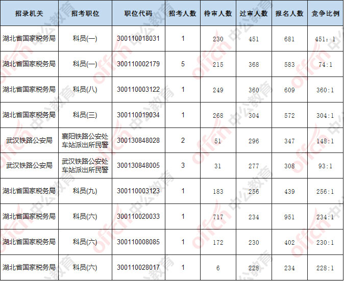 報名通過審核人數前十的職位主要集中在湖北省國家稅務局、武漢鐵路公安局等部門,具體信息如下: