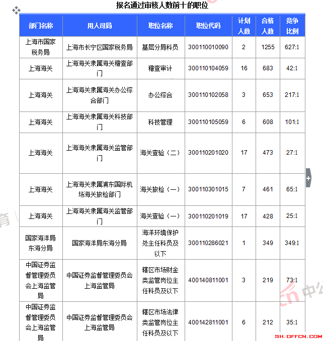 報名通過審核人數前十的職位主要集中在上海市國家稅務局、上海海關、國家海洋局東海分局等部門,具體信息如下: