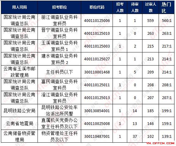 當前最受歡迎的崗位是國家統計局云南調查總隊,麗江調查隊業務科室科員,職位代碼:400110125006,招錄1人,560人報名,其中1人待審核通過,詳情如下圖: