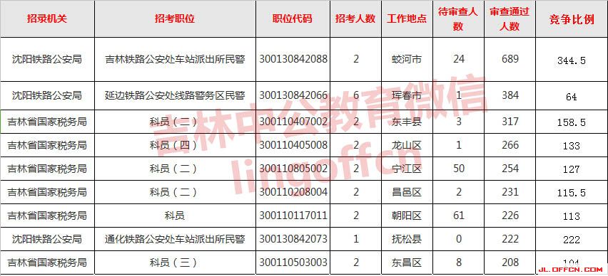 報名通過審核人數前十的職位主要集中在沈陽鐵路公安局、吉林國家稅務局、吉林出入境檢疫檢驗局等部門,具體信息如下: