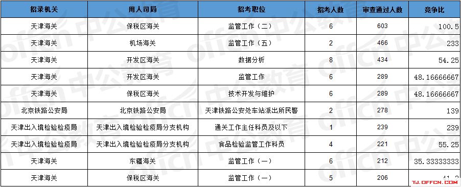 報名通過審核人數前十的職位主要集中在天津海關、北京鐵路公安局、天津出入境檢驗檢疫局等部門,具體信息如下: