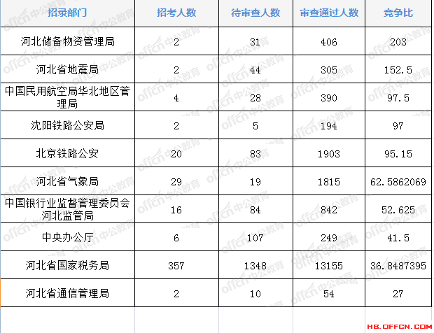 報名通過審核人數前十的職位主要集中在河北省氣象局、北京鐵路公安局、中國民用航空局華北地區管理局等部門,具體信息如下: