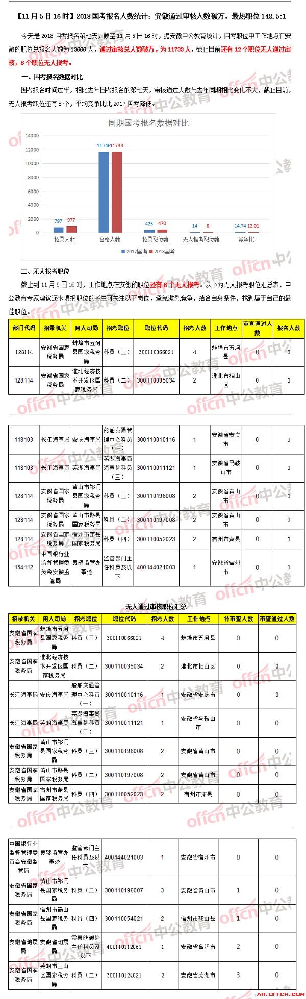 【11月5日16時】2018國考報名人數統計:安徽通過審核總人數破萬,還有8個職位無人報考