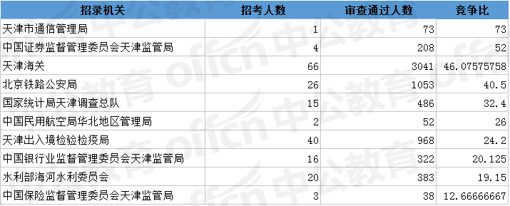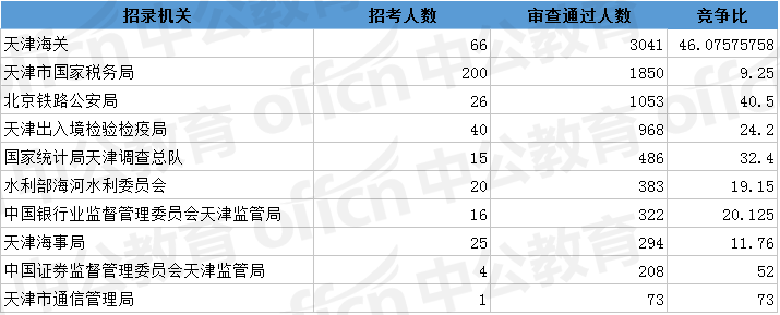 為幫助廣大考生更清晰的了解今日報名情況,中公網(wǎng)校整理了審核通過人數(shù)前十位的部門以及競爭比例最激烈的十大部門,供廣大考生參考: