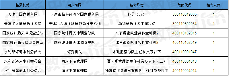 截止到6日09時,工作地點在天津的職位共有7個無人報考,占全部職位的3.3%。下圖是無人報考職位一覽表,中公網校專家建議廣大考生多關注一些較冷職位,避免激烈競爭,結合自身條件,找到屬于自己的職位。