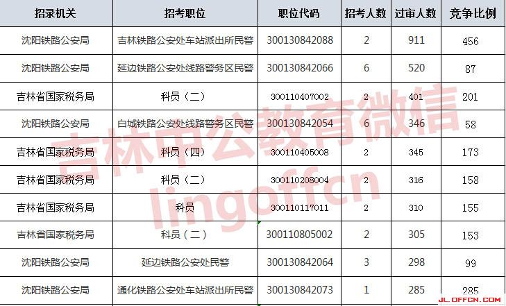 報(bào)名通過審核人數(shù)前十的職位主要集中在沈陽鐵路公安局、吉林國(guó)家稅務(wù)局等部門,具體信息如下: