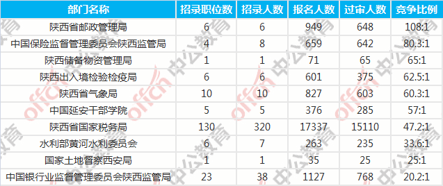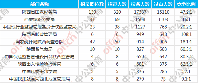 報(bào)名人數(shù)前十的職位主要集中在陜西省國(guó)家稅務(wù)局、中國(guó)保險(xiǎn)監(jiān)督管理委員會(huì)陜西監(jiān)管局、陜西省氣象局等部門,具體信息如下: