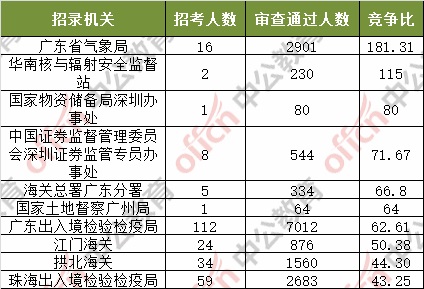 截至11月6日16時,據(jù)中公網(wǎng)校統(tǒng)計,國考職位中工作地點在廣東的職位通過審核總人數(shù)為91224,共有49個職位無人通過審核,平均競爭比例為31.5:1。