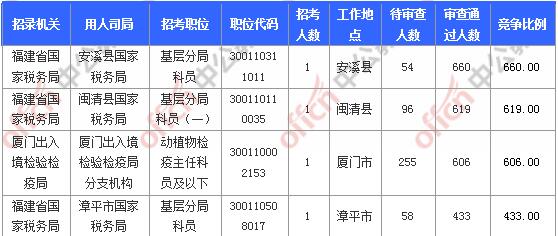 截止到6日16時,競爭比例的職位為福建省國家稅務局安溪縣國家稅務局基層分局科員300110311011一職,招錄1人,截止到6日16時通過人數為660人,競爭比例660:1!