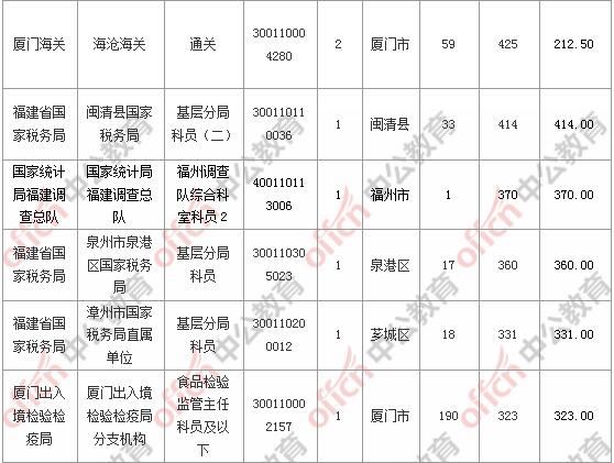 報名通過審核人數前十的職位主要集中在福建省國家稅務局、廈門出入境檢驗檢疫局、廈門海關,具體信息如下: