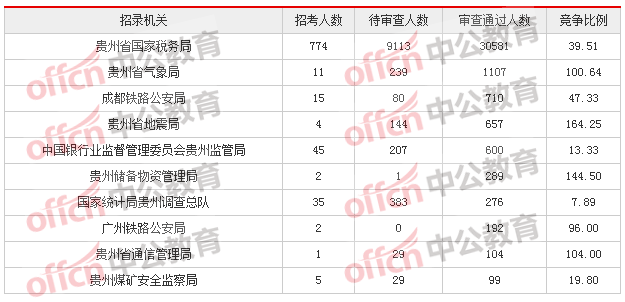 截止到5日16時,報名人數及通過審核人數前三位的部門依次是:貴州省國家稅務局、貴州省氣象局、中國銀行業監督管理委員會貴州監管局,三部門報名人數達到41847人,占總報名人數的92.69%,通過審核總人數達32288人,占通過審核總人數的92.68%。