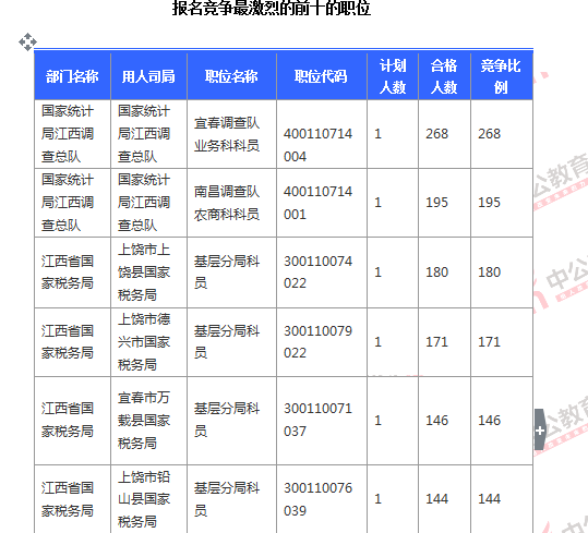 截止到6日16時,競爭比例的職位為國家統(tǒng)計局江西調(diào)查總隊國家統(tǒng)計局江西調(diào)查總隊宜春調(diào)查隊業(yè)務(wù)科科員一職,招錄1人,截止到6日16時通過人數(shù)為268人,位列第二的國家統(tǒng)計局江西調(diào)查總隊國家統(tǒng)計局江西調(diào)查總隊南昌調(diào)查隊農(nóng)商科科員一職,為195:1