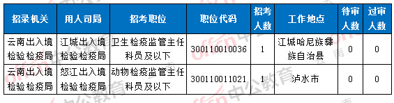 二、截止11月6日16時,2018國家公務員考試云南省2個職位沒有人報名。云南出入境檢驗檢疫局江城出入境檢驗檢疫局,職位代碼300110010036,招考1人。云南出入境檢驗檢疫局怒江出入境檢驗檢疫局,職位代碼300110011021,招考1人。