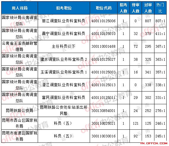 當前最受歡迎的崗位是國家統計局云南調查總隊,麗江調查隊業務科室科員,職位代碼:400110125006,招錄1人,807人報名,其中0人待審核通過,詳情如下圖: