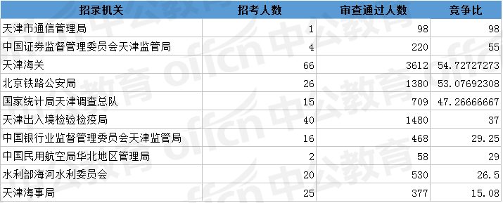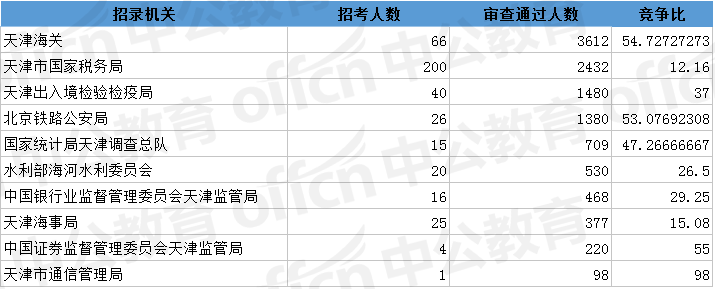 為幫助廣大考生更清晰的了解今日報名情況,中公網校整理了審核通過人數前十位的部門以及競爭比例最激烈的十大部門,供廣大考生參考: