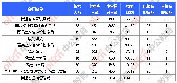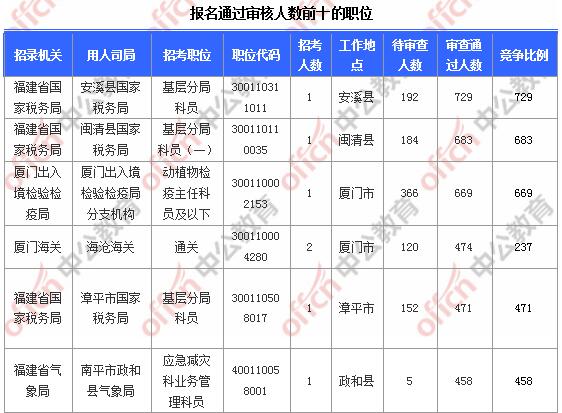 報名通過審核人數前十的職位主要集中在福建省國家稅務局、廈門出入境檢驗檢疫局、廈門海關,具體信息如下: