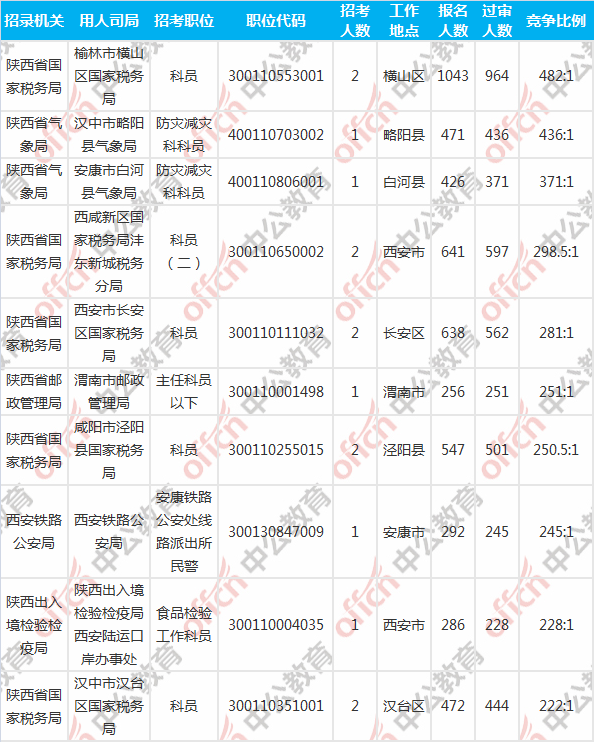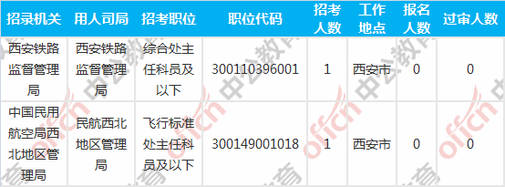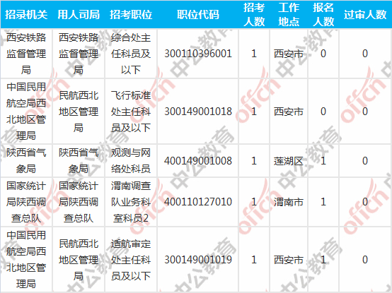 截至到7日9時(shí),工作地點(diǎn)在陜西的,過(guò)審人數(shù)為0的職位共有5個(gè)。下面是過(guò)審人數(shù)為0 的報(bào)考職位一覽表,中公網(wǎng)校專家建議廣大考生再仔細(xì)看看職位表,千萬(wàn)不要錯(cuò)過(guò)了報(bào)名的時(shí)期。