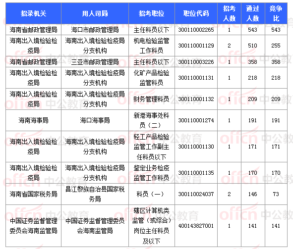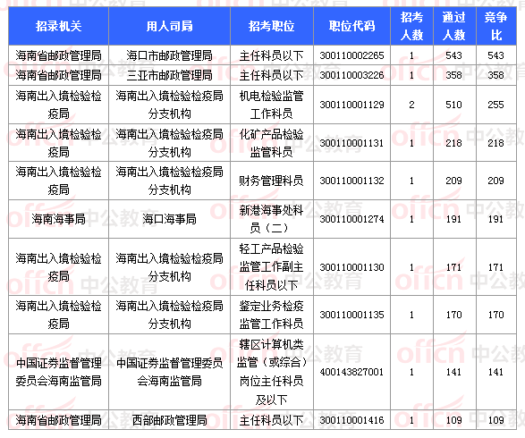 報名通過審核人數(shù)前十的職位主要集中在海南省郵政管理局、海南出入境檢驗檢疫局、海南海事局等部門,具體信息如下: