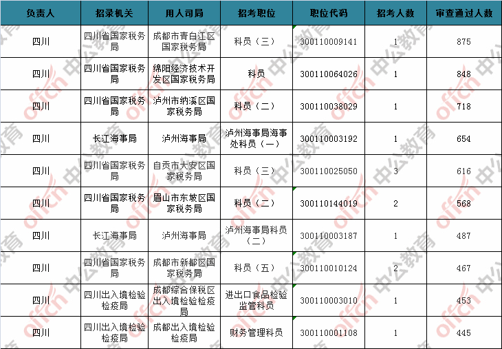 第五日報名通過審核人數前十的職位主要集四川省國家稅務局等部門,具體信息如下: