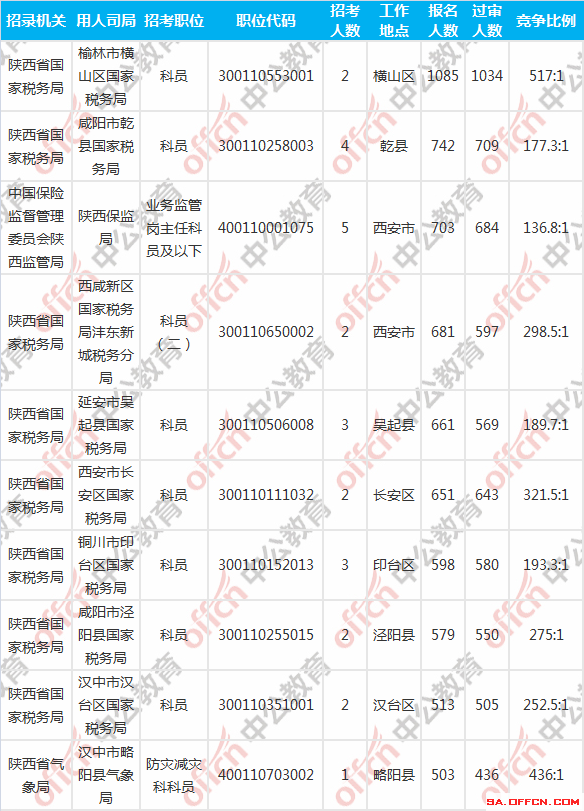 報名人數前十的職位主要集中在陜西省國家稅務局、中國保險監督管理委員會陜西監管局、陜西省氣象局等部門,具體信息如下:
