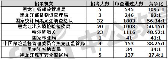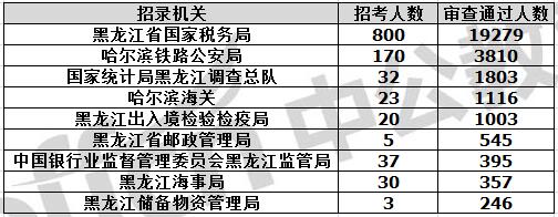 截止到11月7日16時,通過審核人數前三位的部門依次是:黑龍江省國家稅務局、哈爾濱鐵路公安局、國家統計局黑龍江調查總隊,三部門通過審核總人數達24892人,占通過審核總人數的85.28%。其中黑龍江省國稅局審核通過人數,與去年同期相比增加了5595人。