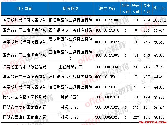 當(dāng)前最受歡迎的崗位是國(guó)家統(tǒng)計(jì)局云南調(diào)查總隊(duì),麗江調(diào)查隊(duì)業(yè)務(wù)科室科員,職位代碼:400110125006,招錄1人,1013人報(bào)名,其中34人待審核通過(guò),詳情如下圖: