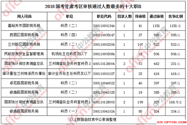 報名通過審核人數前十的職位主要集中在嘉峪關市國家稅務局、西固區國家稅務局、蘭州新區國家稅務局,具體信息如下:
