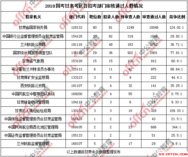 11月8日16時,通過審核人數前三位的部門依次是:甘肅省國家稅務局、國家統計局甘肅調查總隊、中國銀行業監督管理委員會甘肅監管局。三部門通過審核總人數達14696人,占通過審核總人數的73.94%。