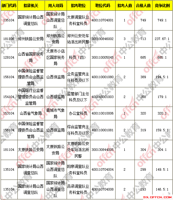 報名通過審核人數前十的職位主要集中在國家統計局山西調查總隊、鄭州鐵路公安局、山西省國家稅務局等部門,具體信息如下: