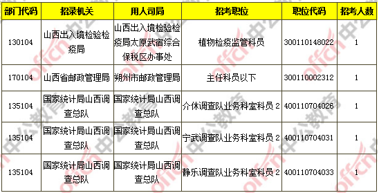 截止到11月8日16時,工作地點在山西的職位共有5個無人報考,占全部職位的1.26%。下面是無人報考職位一覽表,中公網校專家建議廣大考生多關注一些較冷職位,避免激烈競爭,結合自身條件,找到屬于自己的職位。