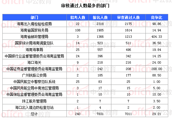 截止到8日17時30分,通過審核人數前三位的部門依次是:海南出入境檢驗檢疫局海南省國家稅務局、海南省郵政管理局、,三部門通過審核總人數達5002人,占通過審核總人數的71.34%。