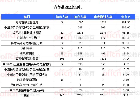 為幫助廣大考生更清晰的了解今日報名情況,中公網校整理了審核通過人數的部門以及競爭比例最激烈的部門,供廣大考生參考: