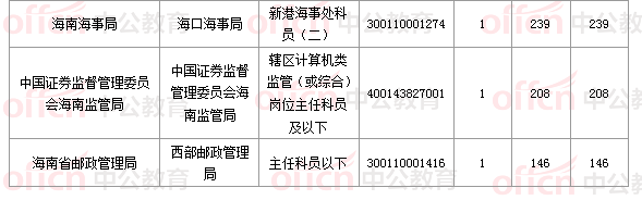 報名通過審核人數前十的職位主要集中在海南省郵政管理局、海南出入境檢驗檢疫局、海南海事局等部門,具體信息如下: