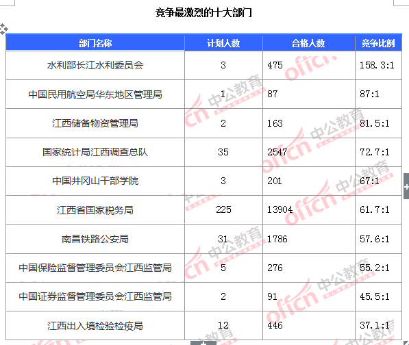 截止到8日17:30時,通過審核人數前三位的部門依次是:江西省國家稅務局、國家統計局江西調查總隊、南昌鐵路公安局,三部門通過審核總人數達18237人,占通過審核總人數的85.3%。