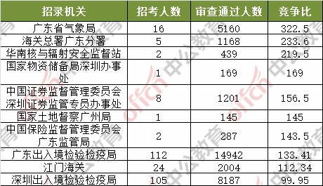 截至11月8日17時30分,據中公網校統計,國考職位中工作地點在廣東的職位通過審核總人數為174724,共有21個職位無人通過審核,平均競爭比例為62.9:1。