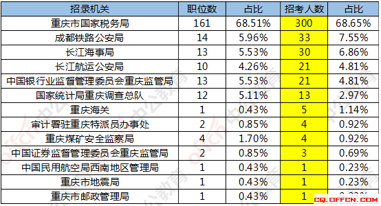 為幫助廣大考生更清晰的了解今日報名情況,重慶中公網校整理了重慶市招錄機關的招錄情況,供廣大考生參考: