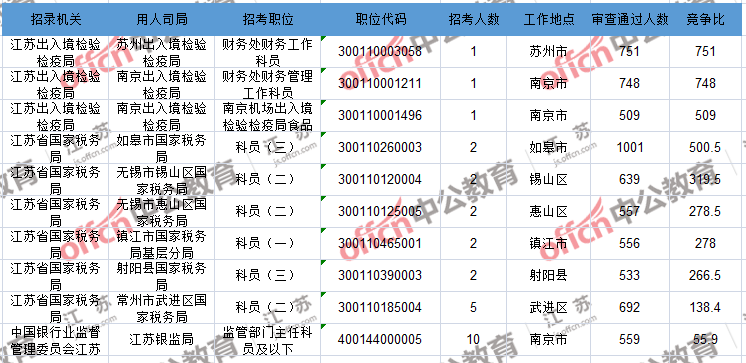 報(bào)名通過審核人數(shù)前十的職位主要集中在江蘇出入境檢驗(yàn)檢疫局、江蘇省郵政管理局、江蘇省國家稅務(wù)局等部門,具體信息如下: